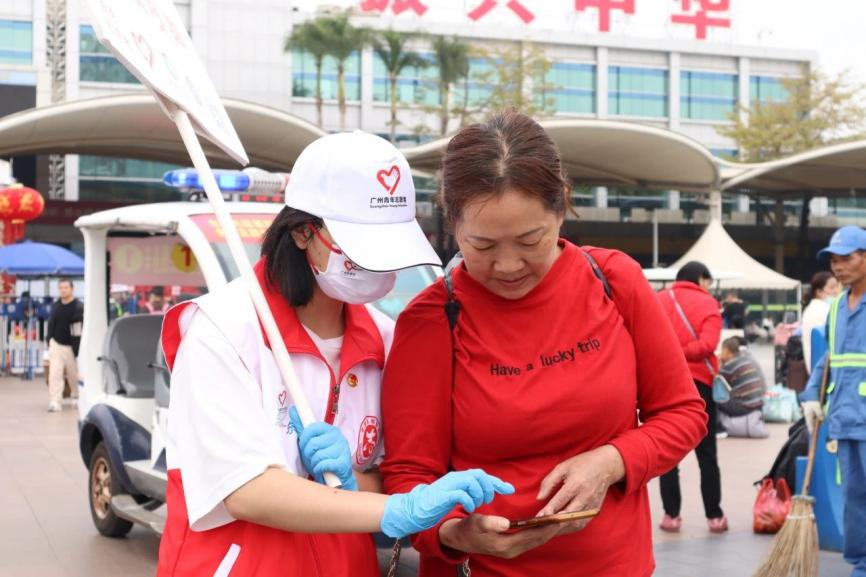 志愿者为旅客提供站前指引服务(图源:广州医科大学公众号)