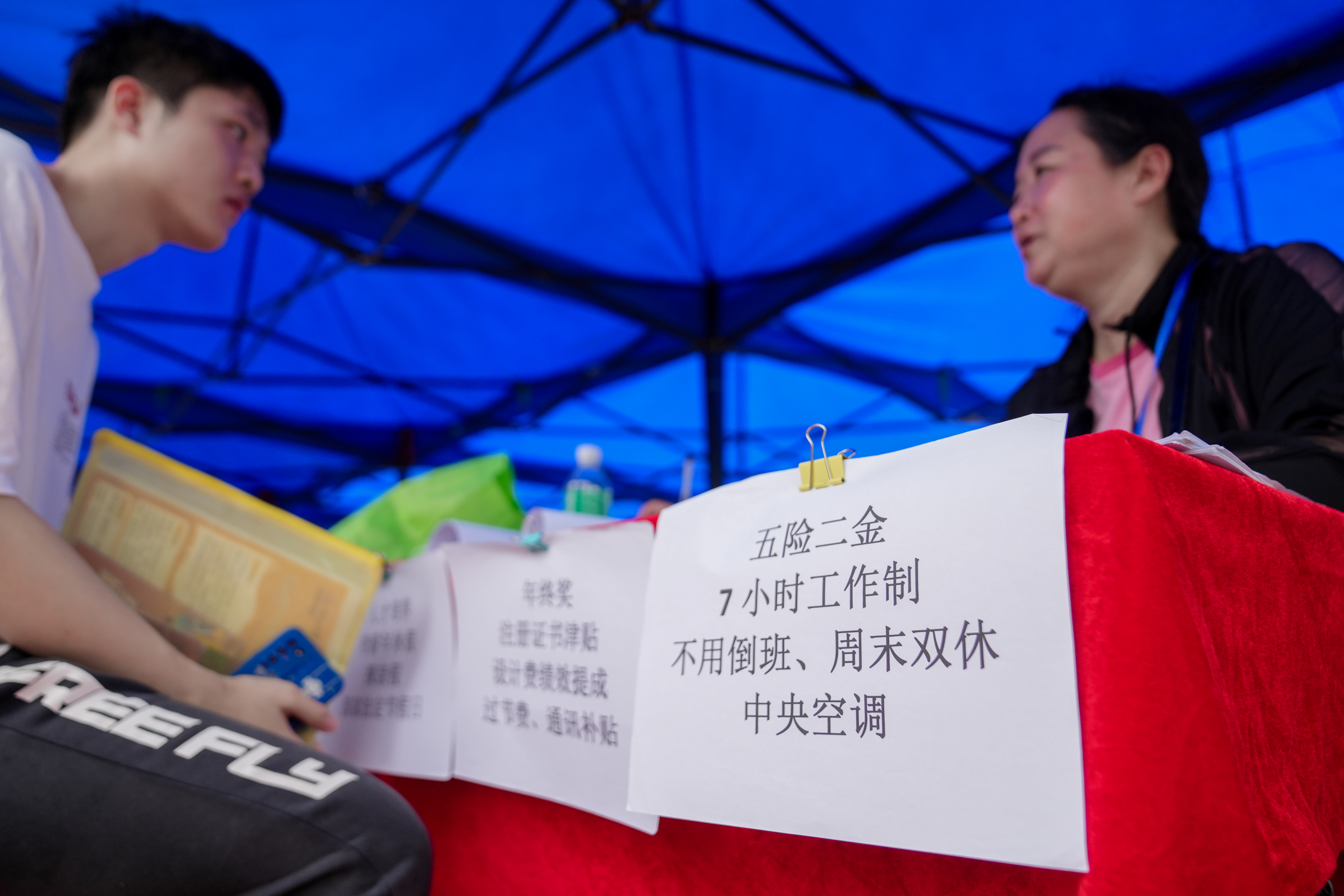 企业在招聘台前张贴了“五险二金”“7小时工作制”等招聘信息.