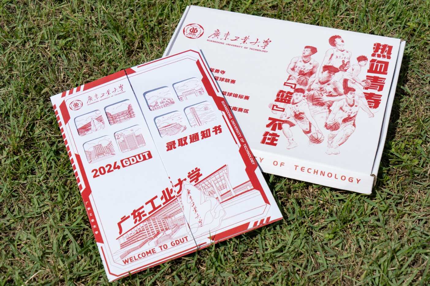 广工2024通知书礼盒整体采用红白灰的简约配色设计,礼盒以“热血青春‘篮’不住”为主题,封面展示广工高水平男子篮球队荣获第25届中国大学生篮球联赛(CUBAL)腾讯体育总冠军、亚洲大学生三对三篮球锦标赛冠军等荣誉,盒中赠送明星球员陈国豪的23号签名球衣,将“勇于拼搏、敢于胜利”的广工精神传递给新广工人,鼓励新生保持青春冲劲,矢志锐意进取。