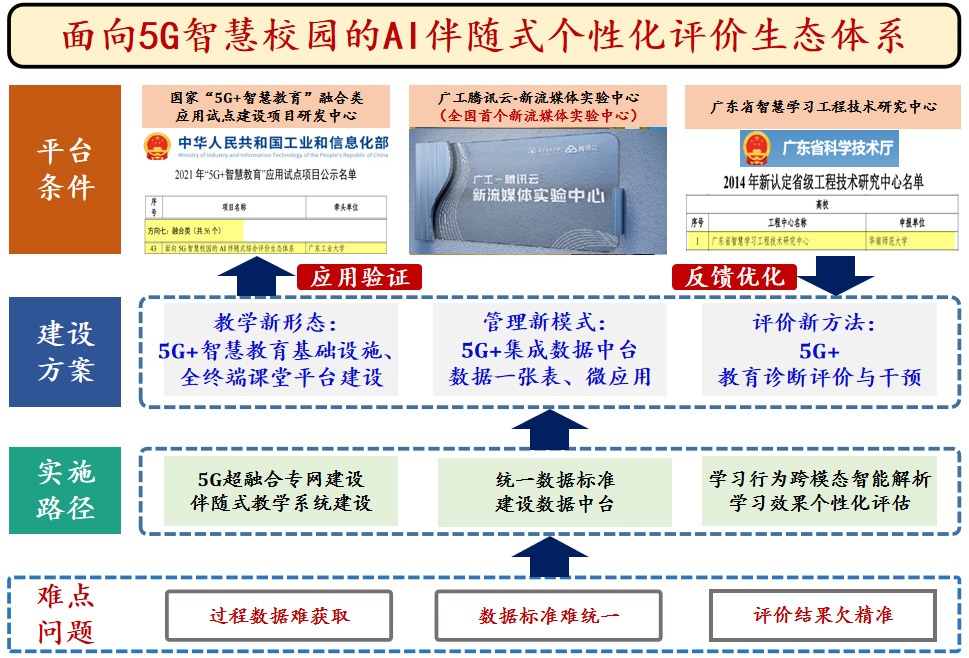 基于教学评价中存在的过程数据难获取、数据标准难统一、评价结果欠精准等痛点难点问题,“AI伴随式个性化评价生态体系”以5G智慧校园的建设为基础,通过“依托5G超融合专网,搭建伴随式教学系统”“出台学校数据标准,建设统一数据中台”“基于跨模态数据智能解析,进行个性化评估”等具体项目的实施,推动基础、教学、管理三融合,将最新的数字化应用落地在学习环境、教育资源、师生素养、教学范式、教育评价等核心环节,先行先试探究高等教育数字化实践过程中形成的新范式,探索加快推动人才培养模式、教学方法和教育治理改革,实现高素质创新型人才培养高质量发展。从2015年开始启动,2021年开始全面建设和实施以来,该体系整体上有效支撑了学校智能教学需求,在实施的过程中取得很好的效果。