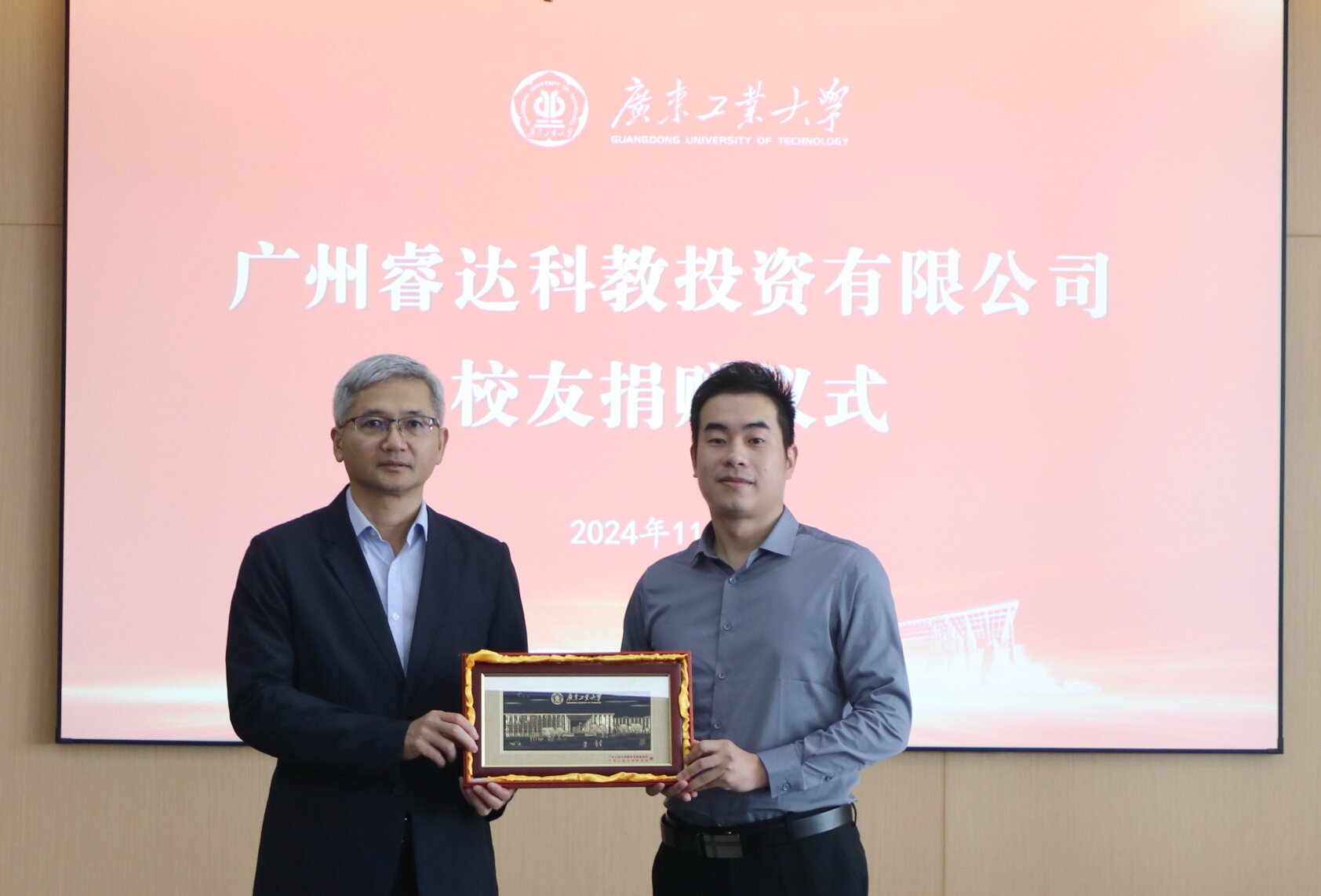 会上,陈卓武代表学校接受广州睿达科教投资有限公司共计110万元的捐赠,其中100万元将用作学校师生奖教奖学金,10万元将用于支持学校“校友之家”建设。陈卓武向黎耀煜、陈健浩颁发捐赠证书及纪念品。